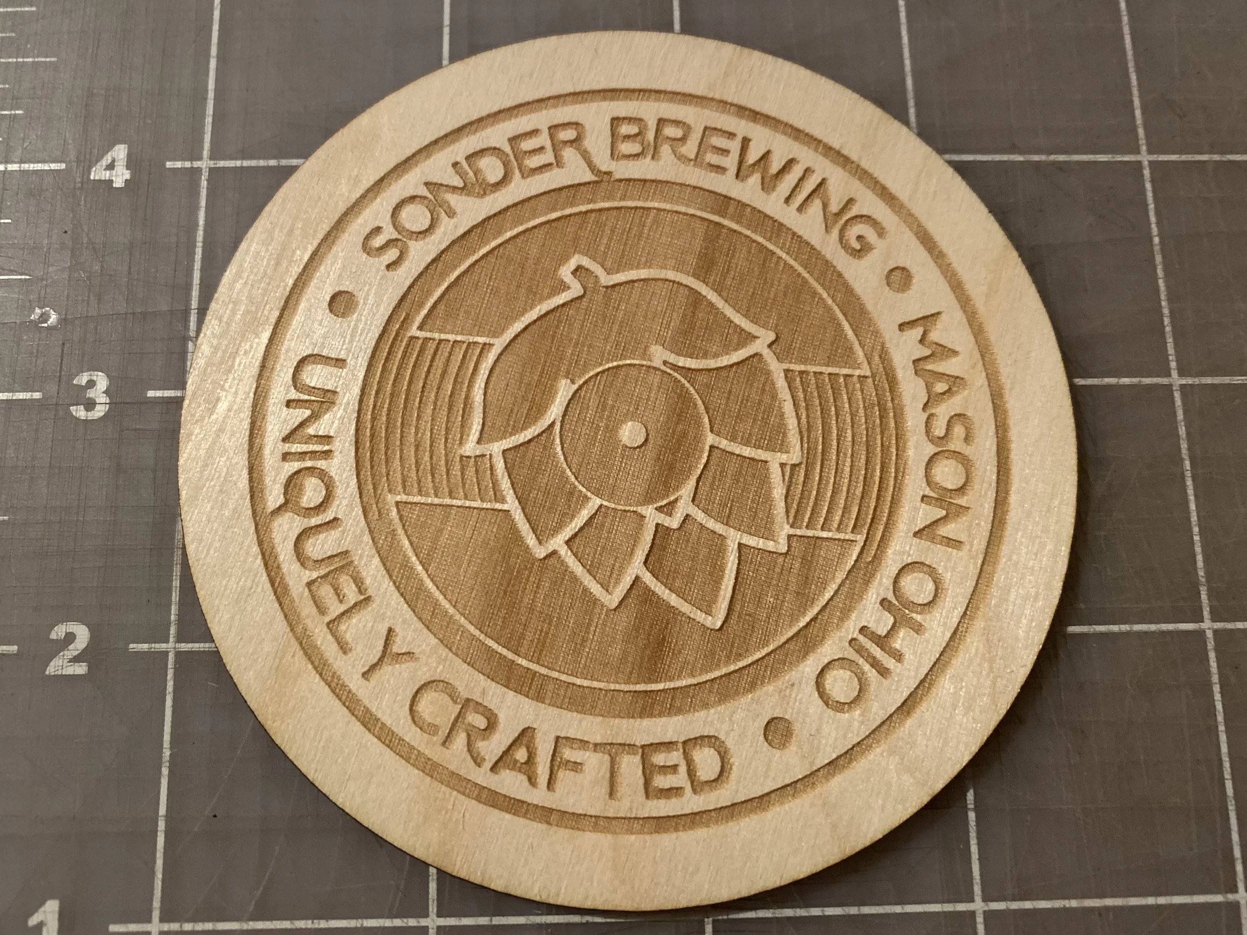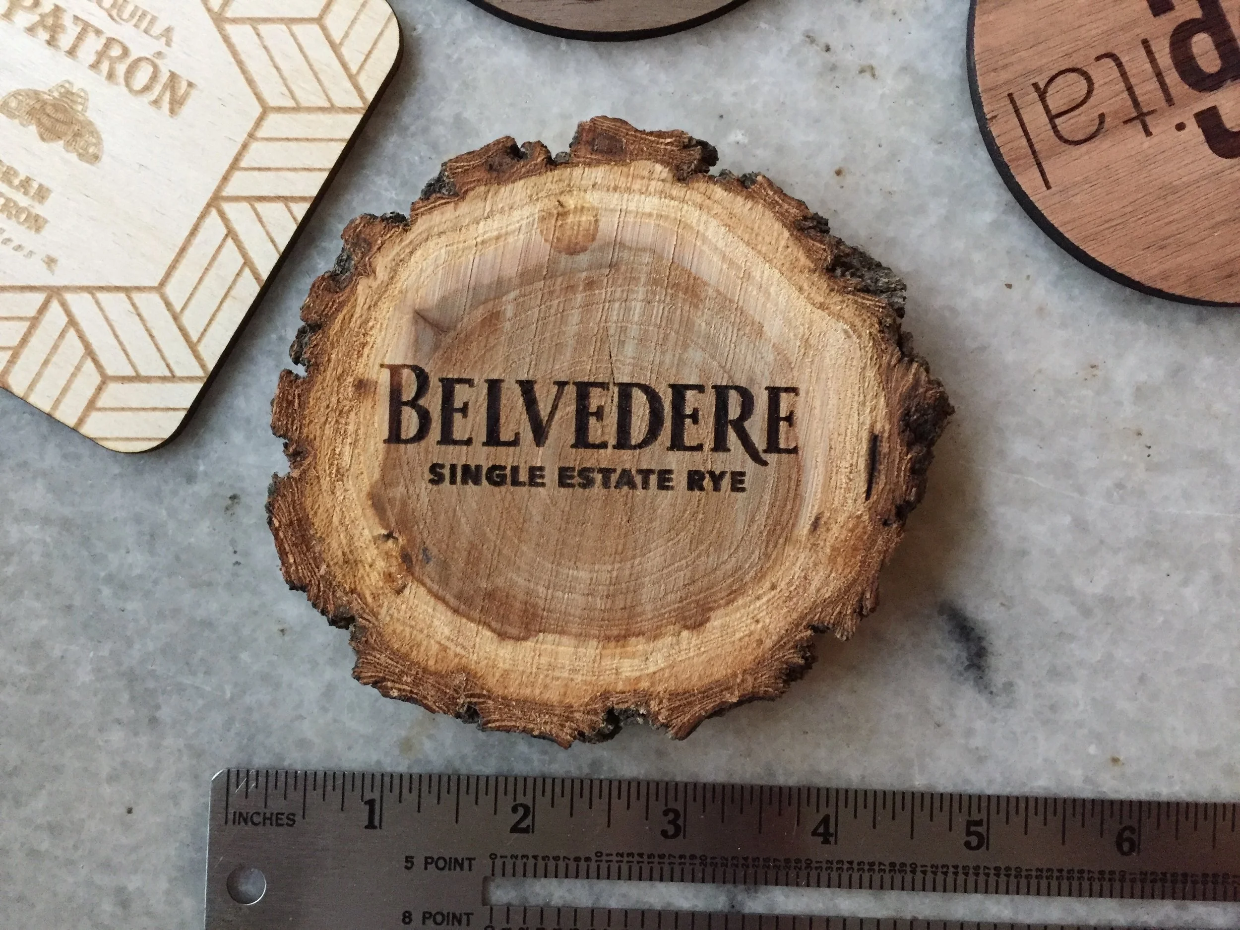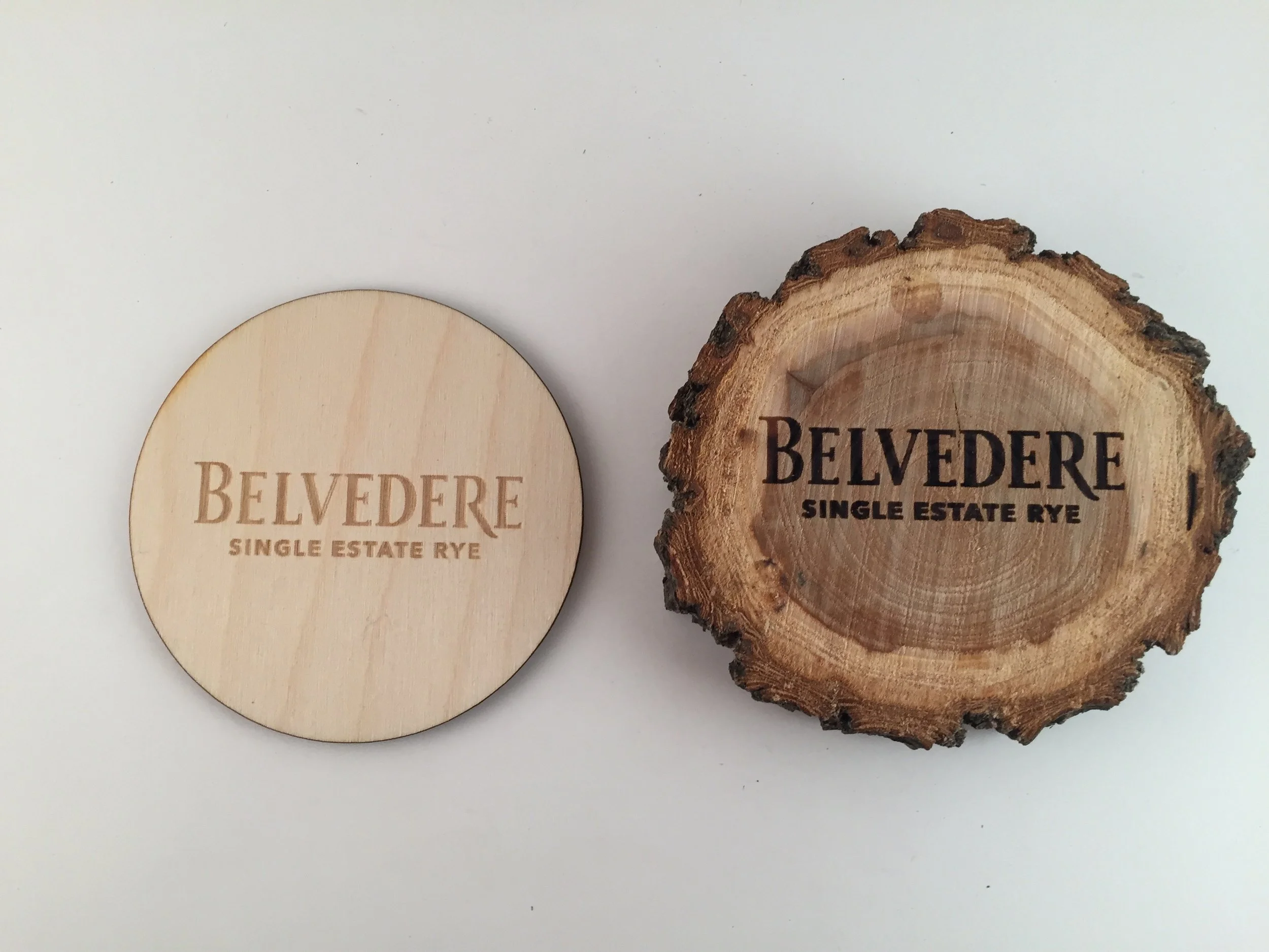 Our most popular and cost-effective option are wooden coasters cut by laser from 1/8 inch thick birch, basswood, cherry, maple, alder, or walnut. Our standard wooden coaster measures 3.5 inches across in your choice of circles or squares with rounded corners.